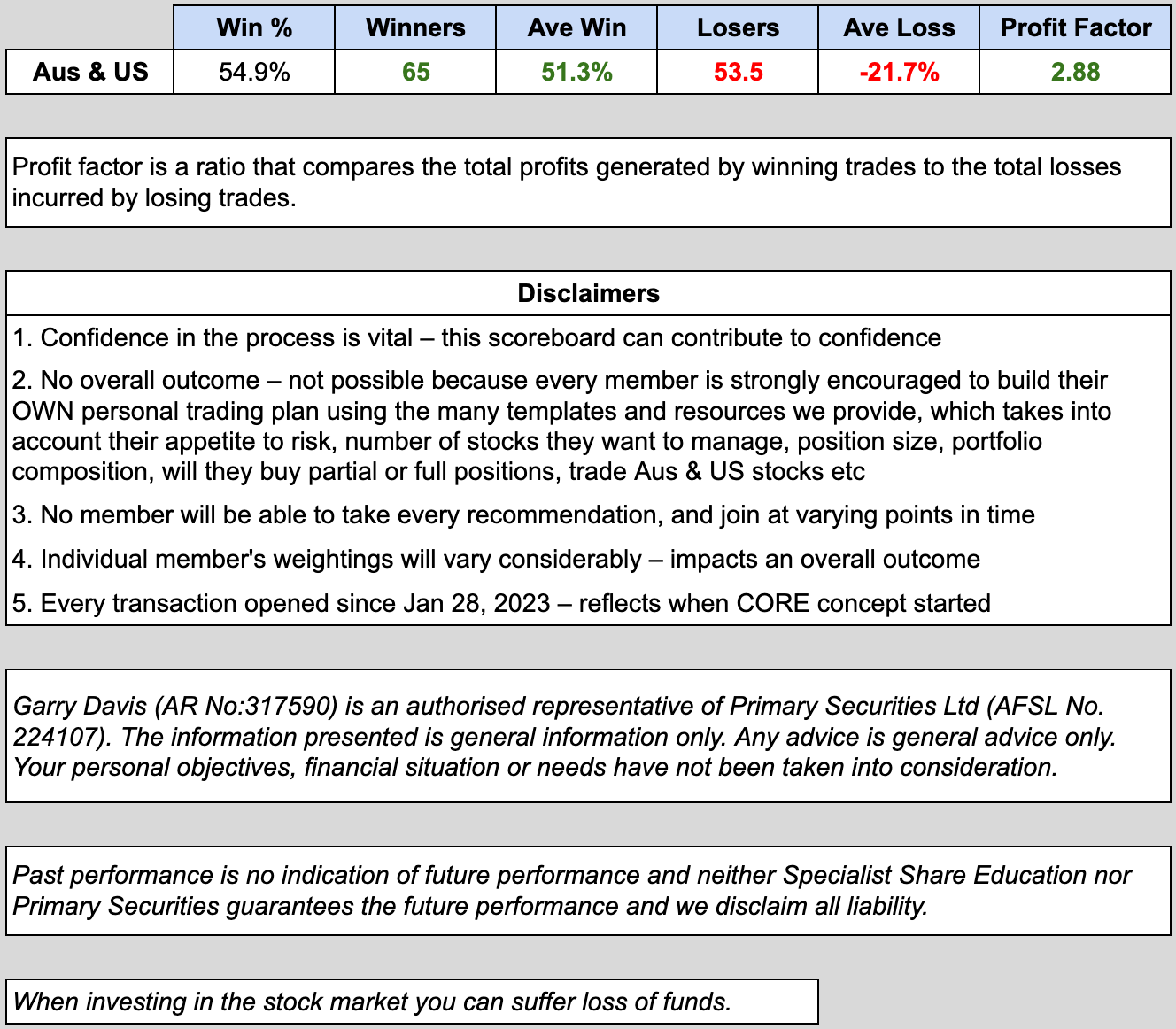 *Current as at 7/3/26. Use of performance results has been through a thorough compliance review and the full record of trades taken is available within the member's portal. The snapshot below is updated every Saturday, for better or worse.